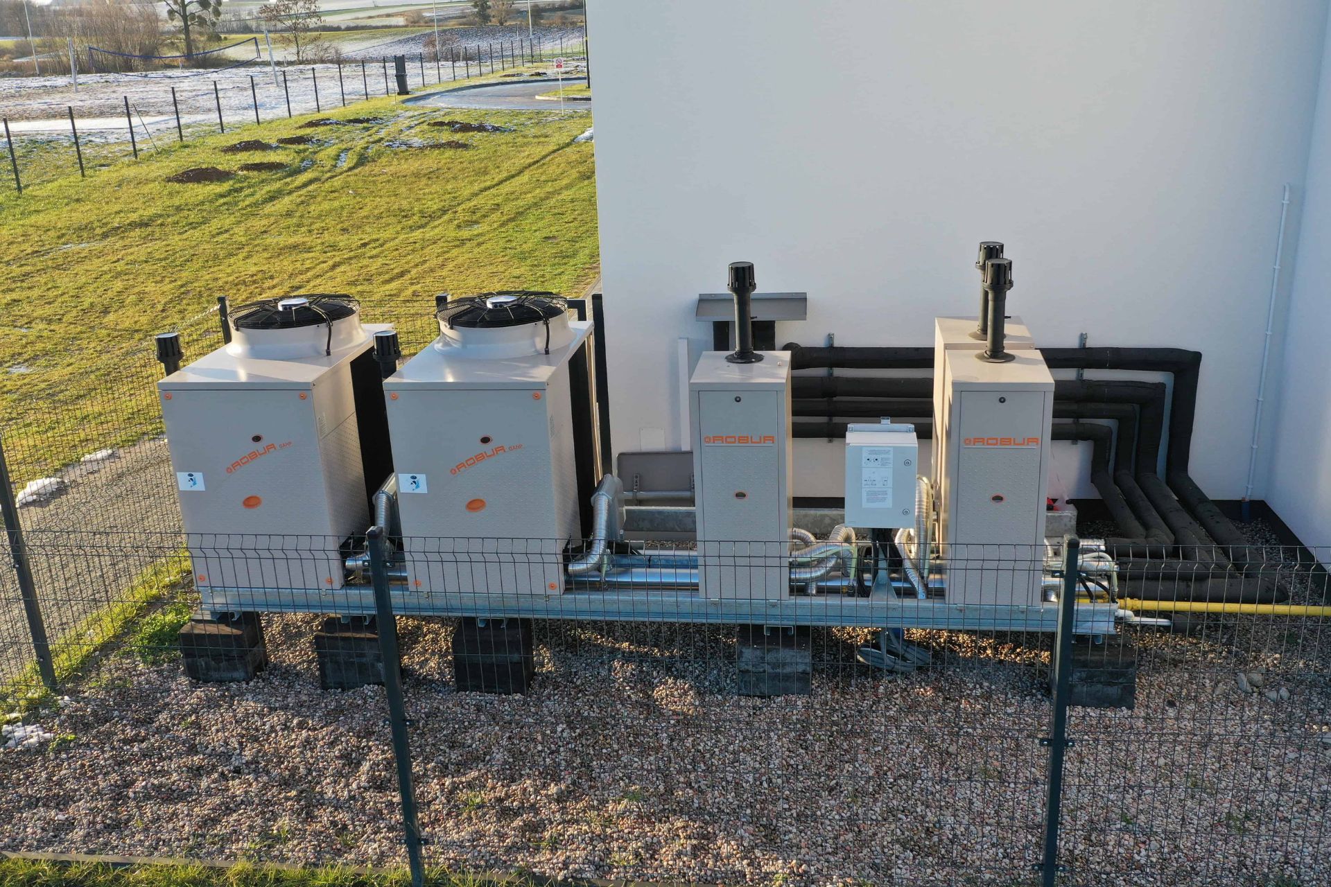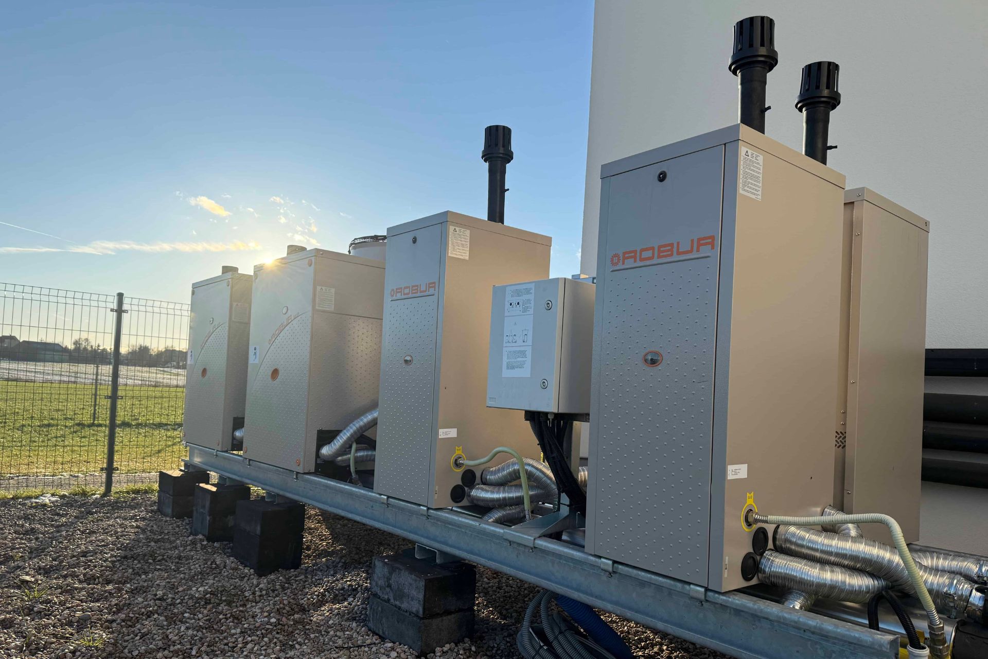 Zestaw składający się z dwóch absorpcyjnych pomp ciepła zasilanych gazem w wersji wyciszonej oraz trzech kondensacyjnych kotłów gazowych.